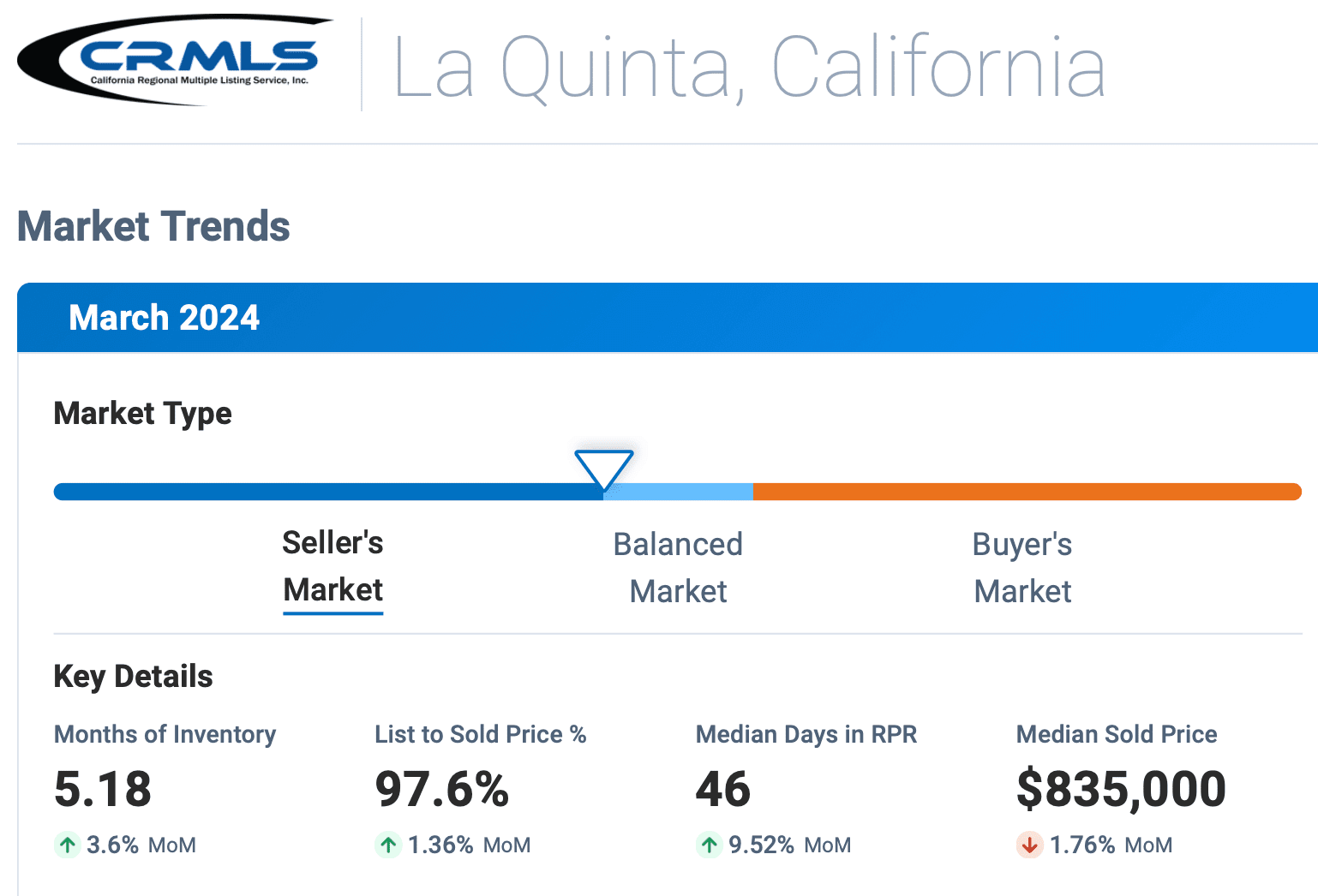 La Quinta is indicating a healthy and active market, as of March 2024, we are seeing a 5.18 Months Supply of Inventory. Over the last 12 months, we've seen a positive trend with a +9.28% increase in Months Supply of Inventory. More opportunity for buyers and investors to acquire. La Quinta is a celebrity hot spot and has attracted residents such as Kim Kardashian-West, Tom Brady and Kylie Jenner.