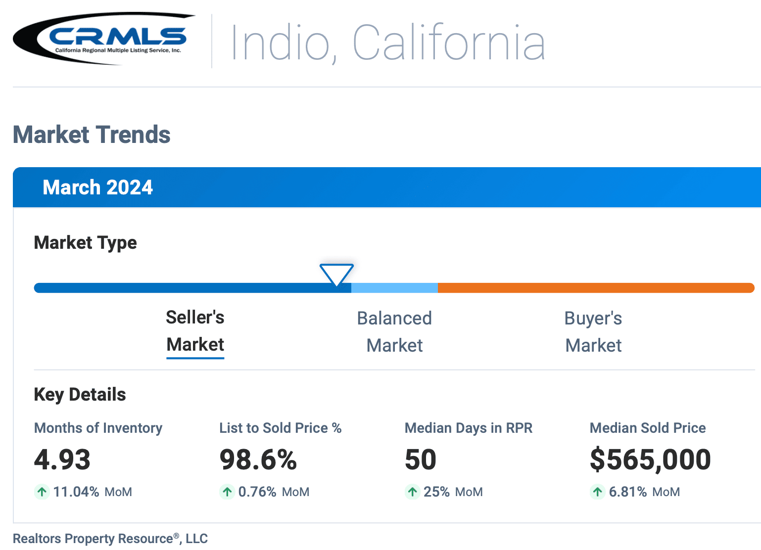 Currently in Indio, there are 4.93 Months Supply of Inventory, a +61.11% increase over the last 12 months. Feeling more balanced market compared to other regions of the state.