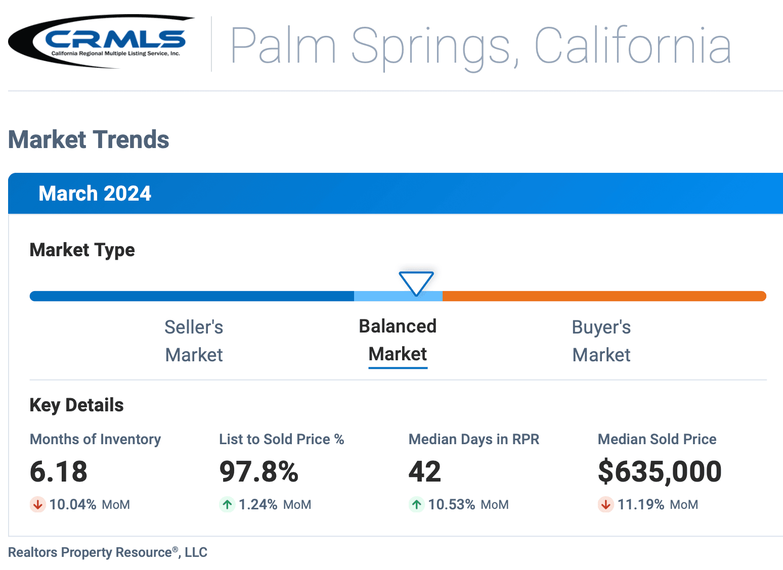 Thinking about buying or selling in Palm Springs, California? 🌴 As of March 2024, there is a 6.18 Months Supply of Inventory in the market, showing a 32.9% increase over the last year. With a median Sold Price of $635,000 and a List to Sold Price percentage of 97.8%, now is the perfect time to make a move!